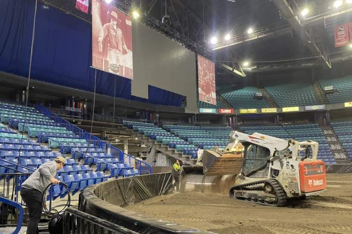 From ice to dirt: SaskTel Centre undergoes rapid transformation for PBR tour stopIt's a tight turnaround at SaskTel Centre with the usual WHL ice surface of the Saskatoon Blades being replaced with dirt for the 2024 PBR Saskatoon Classic bull riding event.SportsOct 24, 2024