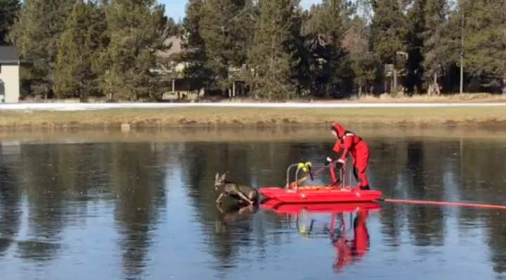 Red-suited man on a sleigh pushes deer to safetyReindeer are supposed to pull Santa Claus' sleigh, but in Oregon recently, a red-suited man on a sled wound up pushing a deer.WorldDec 11, 2017