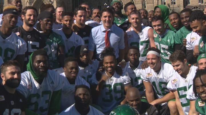 Saskatchewan Roughriders hold practice on grass in front of Parliament buildingThe Saskatchewan Roughriders held their workout Tuesday on Parliament Hill in Ottawa and Prime Minister Justin Trudeau made a surprise appearance.SportsOct 11, 2016