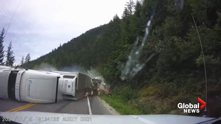 Shocking semi crash near Sicamous, B.C., caught on dashcam videoA westbound semi hauling a trailer loaded with grocery products crossed a double-solid line, flipped onto its side and skidded down the highway.Jul 20, 2020