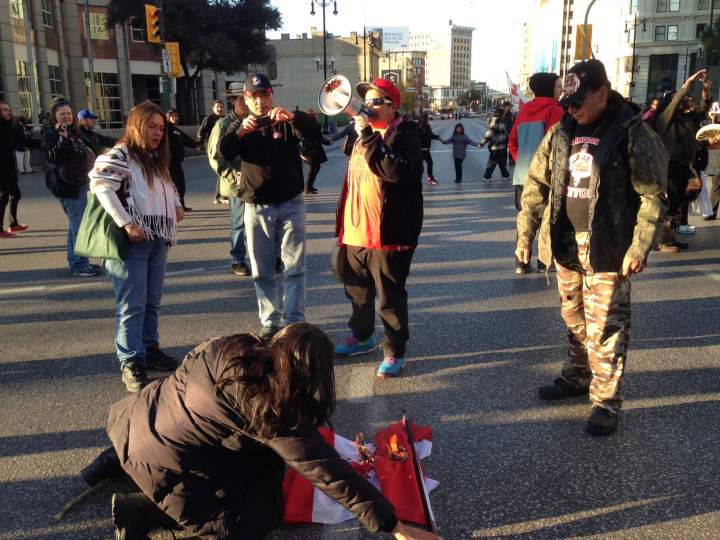 Protesters burn flag in Winnipeg after clash in New BrunswickFirst Nations protesters in Winnipeg tied up traffic at the famous Portage and Main intersection and burned a Canadian flag late Thursday.CanadaOct 17, 2013