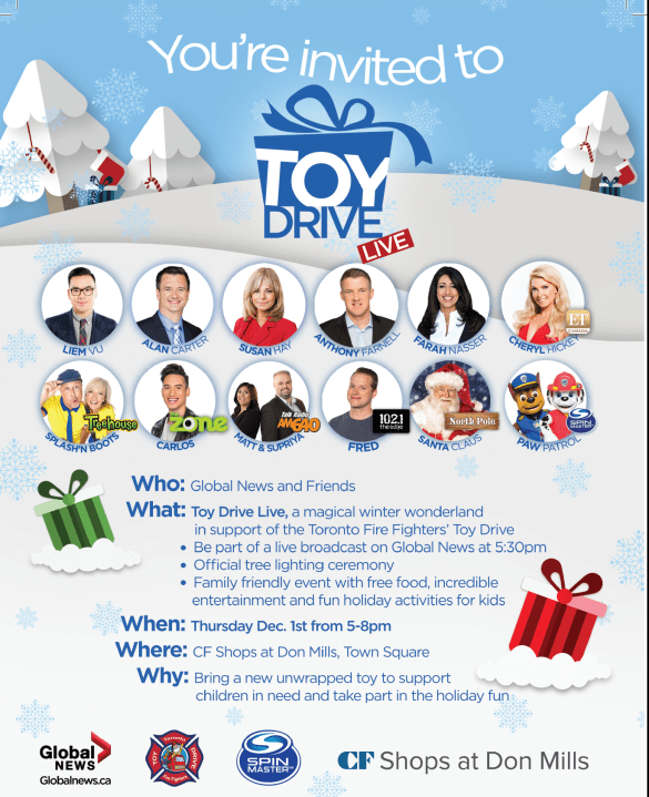 Help support the Toronto Fire Fighters’ Toy DriveGlobal News is excited to be partnering with the Toronto Fire Fighters for a ninth year in a row to support the annual Fire Fighters' Toy Drive.Nov 16, 2015