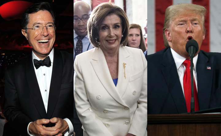 ‘She ripped him a new one’: Stephen Colbert riffs off Nancy Pelosi tearing up Trump speech"Next time, don’t offer your hand, just offer him one finger," the 'Late Show' host said after Donald Trump ignored Nancy Pelosi's offer of handshake during the State of the Union.EntertainmentFeb 5, 2020
