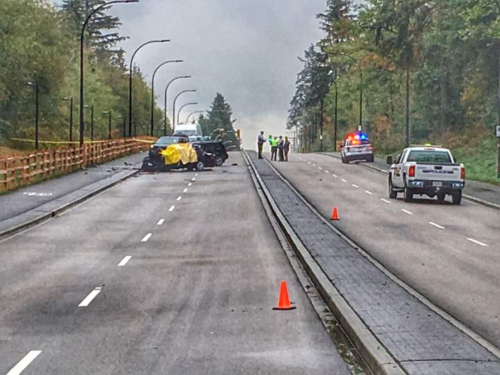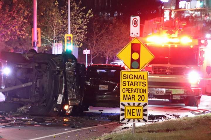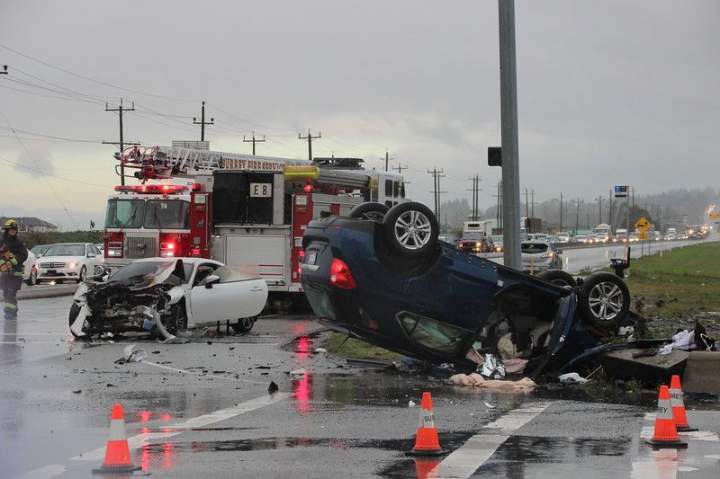 Two-vehicle accident injures five, stalls traffic in SurreyOne vehicle rolled over onto its roof, while the other went up in flames.Oct 17, 2017