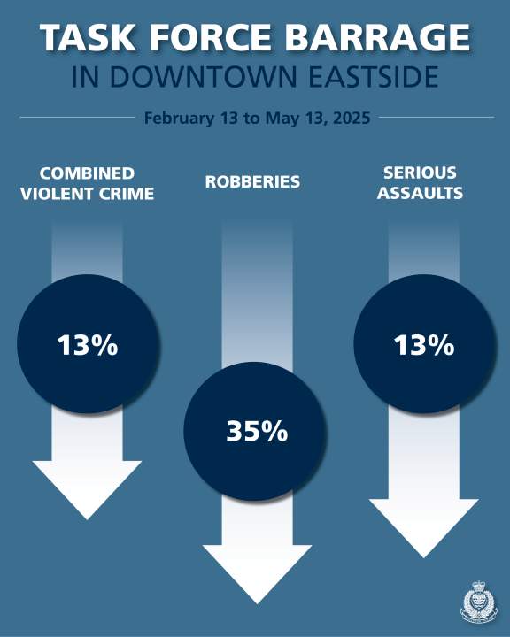 Violence, street crime down in Vancouver’s DTES due to task force, police sayTask Force Barrage was launched three months ago to target criminals and criminal activity in the Downtown Eastside.CrimeMay 22