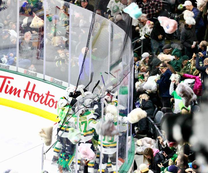 London Knights set new Teddy Bear Toss record in 4-1 win over the Sarnia StingA new record of 11924 Teddy Bears were tossed onto the ice by London Knights fans after Jared Woolley's first OHL goal brought them out of the stands.SportsDec 5, 2023
