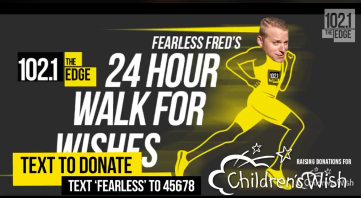 Fearless Fred, 102.1 the Edge host, commits to walking 24 hours straight for charityFearless Fred from 102.1 the Edge endured a 24-hour walk for wishes which began at 2 p.m. on Thursday, May 24 and ended on Friday, May 25 at 2 p.m.EntertainmentMay 25, 2018