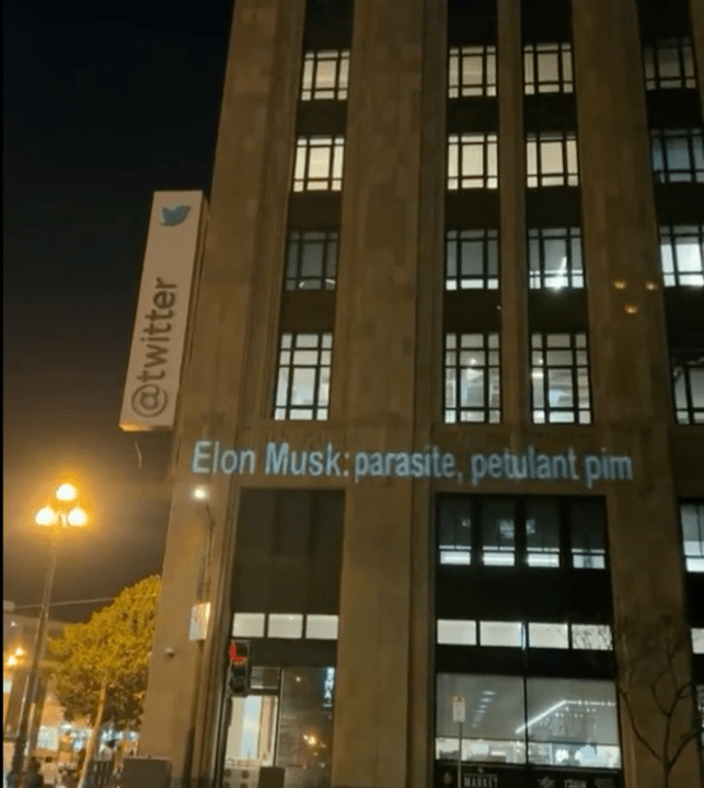 Twitter HQ lit up with Elon Musk insults amid office closure, employee exitsA series of insults were projected on Twitter's headquarters, taking jabs at CEO Elon Musk following news that hundreds of employees were choosing to leave.TrendingNov 18, 2022