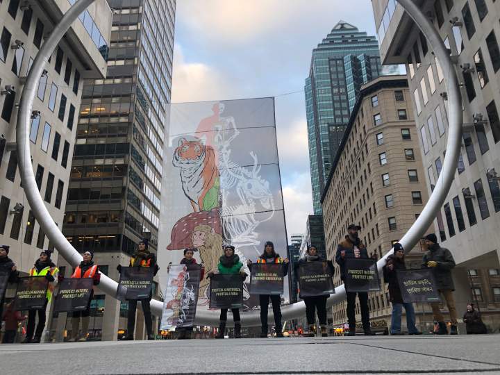 Greenpeace demonstrators hoist banner in downtown Montreal during COP15 summitA large banner of artwork was hoisted at the centre of the ring at Place Ville Marie to denounce the decline of biodiversity around the world.EnvironmentDec 8, 2022
