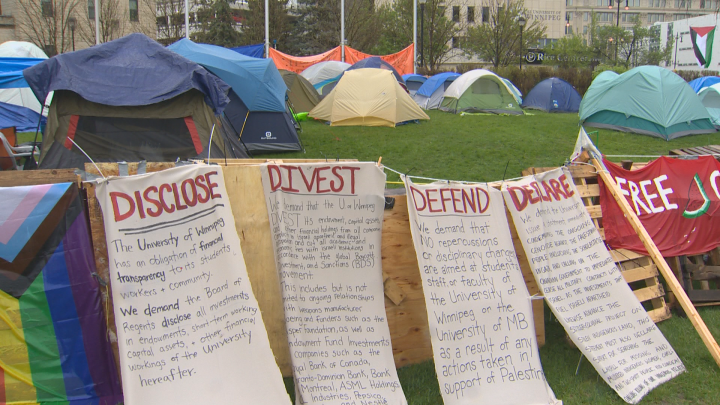 Encampments at Winnipeg universities not going anywhere until demands met: protestersProtesters at pro-Palestinian encampments at the University of Manitoba and the University of Winnipeg say they don't plan to go anywhere until their demands are met.CanadaMay 14, 2024