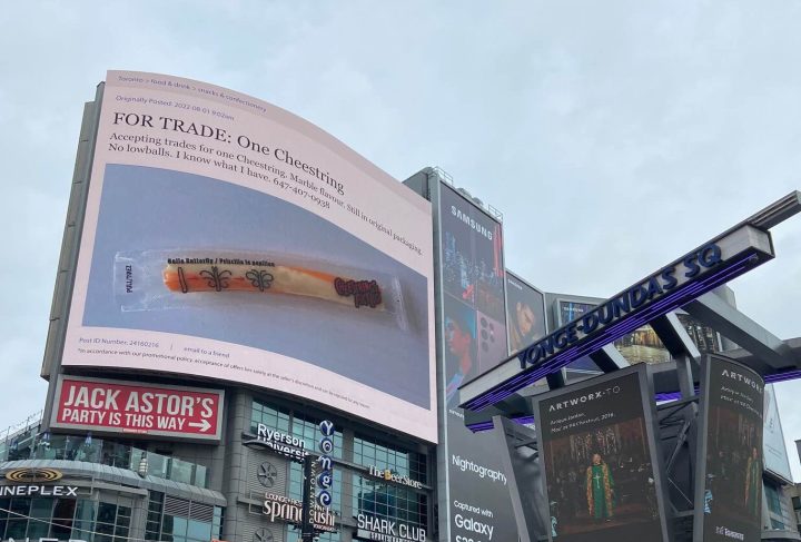 Man buys large billboard in Yonge-Dundas Square to trade single cheese stringAngel Domingo, who bought the advertising space, said he found the cheese string in the refrigerator of his new home when he moved to Toronto.CanadaAug 4, 2022