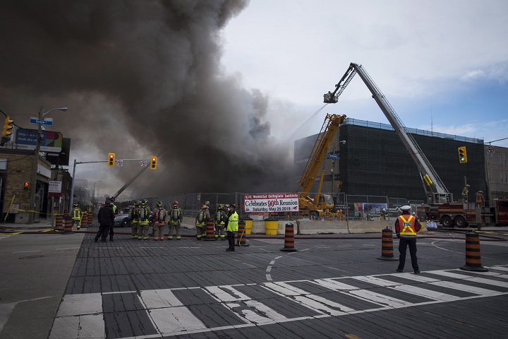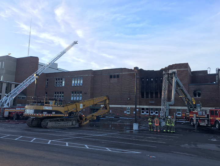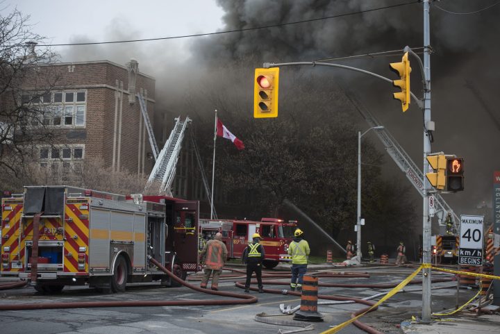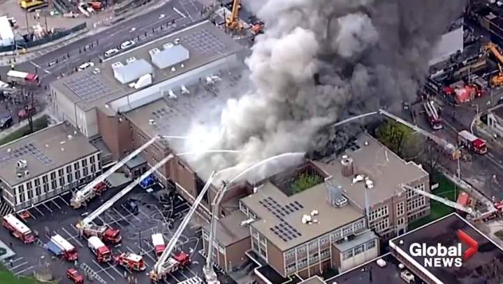York Memorial C.I. roof collapses as crews battle 6-alarm fireToronto Fire Services Chief Matthew Pegg said heavy equipment was being brought in order to "strategically" take parts of the building down in order to allow firefighters to put out hot spots.CanadaMay 7, 2019