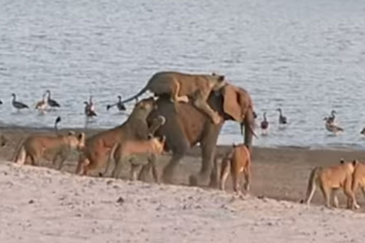 WATCH: Young elephant fends off pride of lionsA baby elephant managed to survive an attack by 14 female lions in Zambia.WorldNov 12, 2014