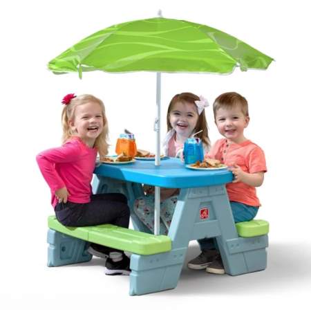 Kids love having their own place to eat or craft outside, and this kid-friendly picnic table has been a favourite with our kids for years. There’s enough room for four small bums at a time, the umbrella protects them from the sun, and the plastic material is sturdy, easy to wipe down, and lasts for years.