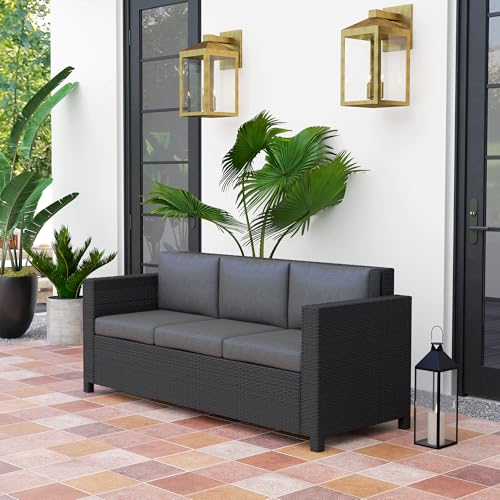 Cozy up or stretch out and enjoy the outdoors – this 3-seater rattan sofa is the perfect spot for family time or hosting friends, with plush cushions, curved armrests, and weather-ready wicker.