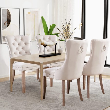If you’re going lux, you might as well go full Hollywood glam. The sophisticated tufted dining chair features a padded seat and high backrest that elevates your dining experience from ordinary to something memorable. This plush Wayfair option is made with sturdy curved solid wood legs and silver decorative studs. It’s also practical: the chairs have a pull ring for pulling out the chairs without needing to constantly handle the fabric. Sold as a set of six, you have the whole table covered.