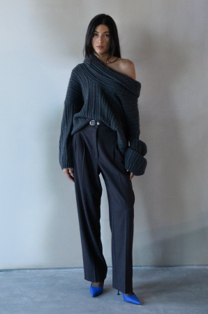 This oversized slouchy off-the-shoulder sweater features a soft ribbed knit, perfect for styling off one or both shoulders. Its relaxed fit pairs well with high-rise trousers and heels, and sizing down one or two sizes is recommended for the best look.
