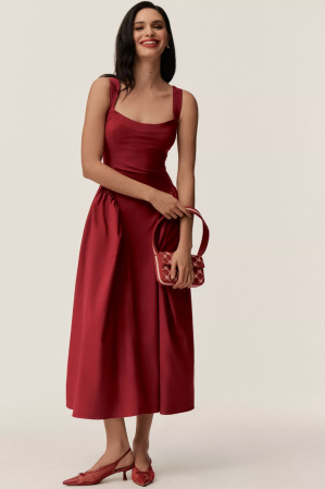 This fit-and-flare midi is undeniably romantic, featuring a structured bodice and a full, flowing skirt perfect for weddings or special occasions. Crafted from a soft blend of viscose, cotton, and elastane.