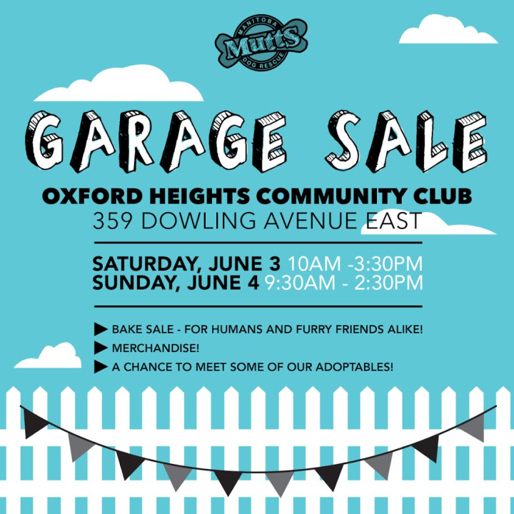Manitoba Mutts Dog Rescue Garage SaleGarage Sale in support of Manitoba Mutts Dog Rescue! Tons of goodies for the home, clothing, décor, etc; bake sale (for humans and your furry family members!); and adoptable dogs will be there to meet you! Saturday June 3 from 10:00am until 3:30pm; Sunday June 4 from 9:30am until 2:30pm.OtherJun 3 - Jun 4